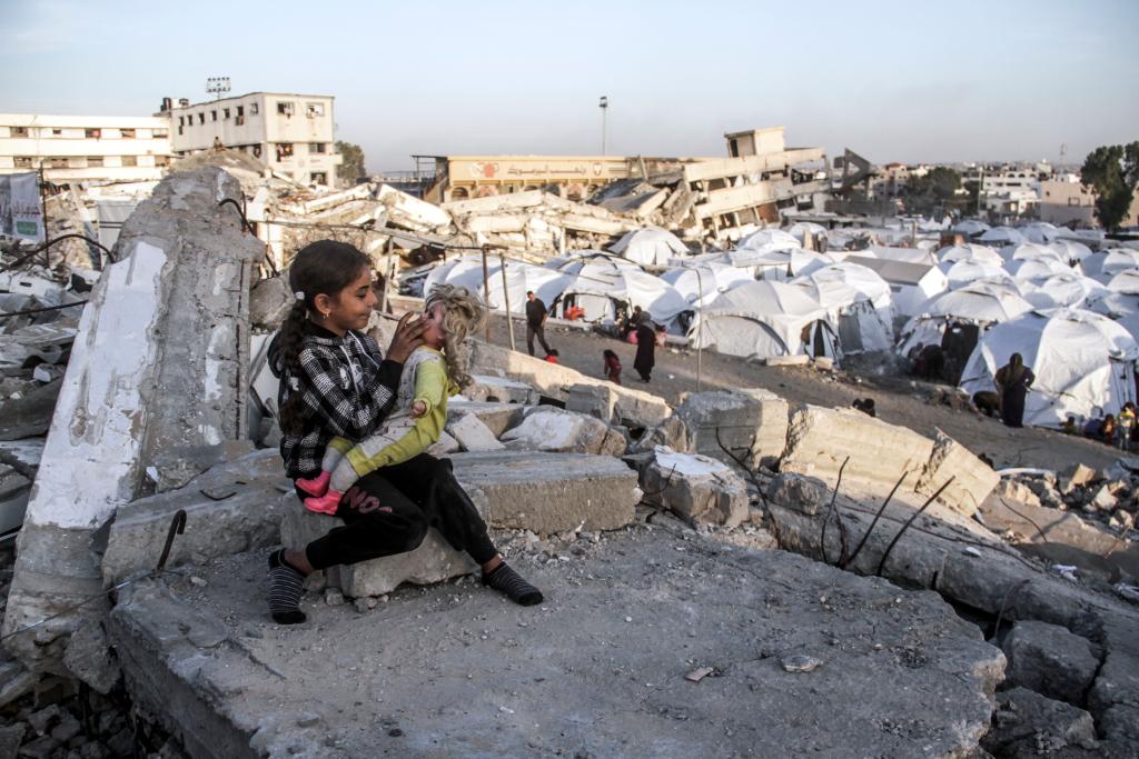 12月9日,在加沙地帶加沙城,一名流離失所的女孩在一處臨(lin) 時帳篷區玩玩具。新華社發(馬哈茂德·紮基攝)