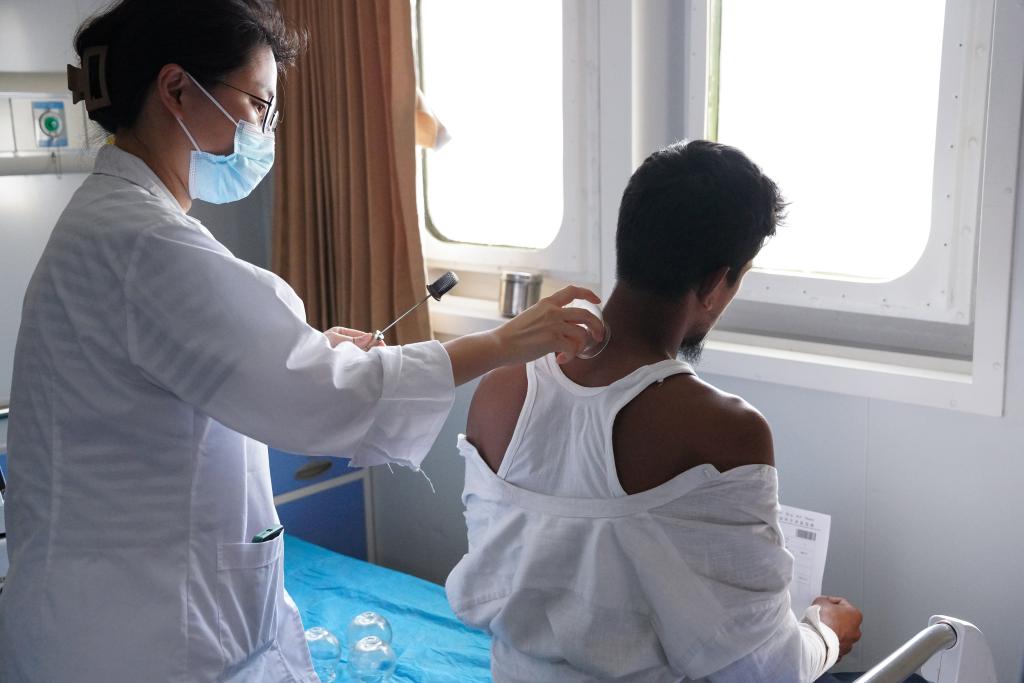 2024年12月24日,在斯裏蘭(lan) 卡科倫(lun) 坡港,中國海軍(jun) “和平方舟”號醫院船上的醫生為(wei) 19歲的小夥(huo) 穆賈希德拔火罐。(新華社記者伍嶽攝)