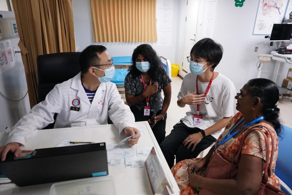 2024年12月24日,在斯裏蘭(lan) 卡科倫(lun) 坡港,中國海軍(jun) “和平方舟”號醫院船上的醫生在誌願者的幫助下對當地患者進行問診。(新華社記者伍嶽攝)