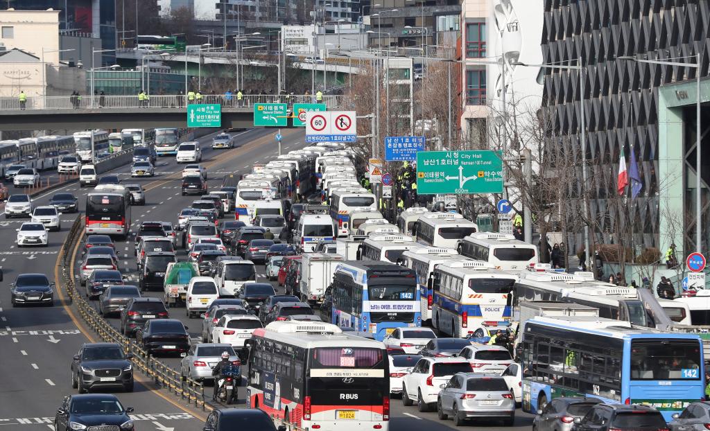 1月3日,大量警方車輛停在韓國首爾龍山區漢南洞的總統官邸附近。新華社記者姚琪琳攝