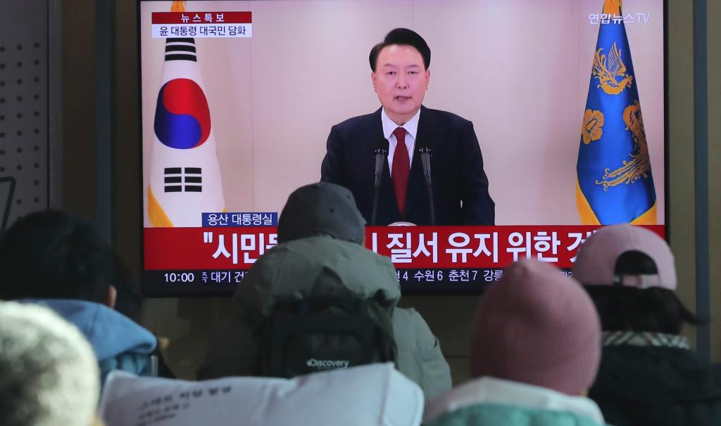 2024年12月12日,在韓國首爾火車站,韓國民眾(zhong) 觀看總統尹錫悅對國民談話的電視直播。新華社記者姚琪琳攝