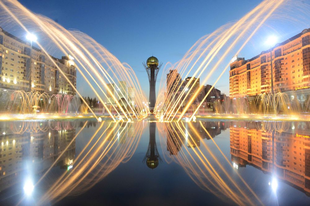 這是2017年6月11日拍攝的哈薩克斯坦首都阿斯塔納的巴伊傑列克觀景塔夜景。新華社記者沙達提攝