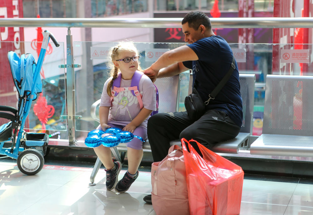 2024年7月26日,在中哈霍爾果斯國際邊境合作中心,來自哈薩克斯坦的遊客在購物後休息。新華社記者林立平攝