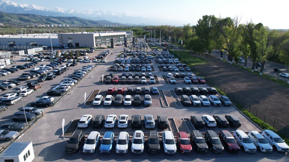 2023年5月5日,汽車停放在哈薩克斯坦阿拉木圖一家大型二手車交易市場(無人機照片)。新華社發(奧斯帕諾夫攝)