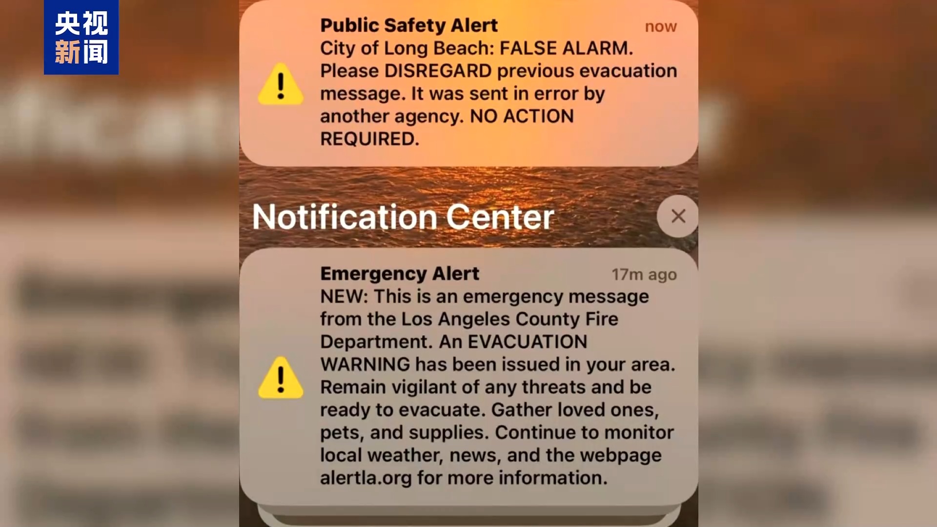 央視記者 劉驍騫:與(yu) 此同時,根據我在一線的觀察,人為(wei) 造成的災害正在出現。首先,洛杉磯縣的警報發布係統嚴(yan) 重失靈,造成撤離信息的混亂(luan) 。一般情況下,如果你所在的區域處於(yu) 撤離預警或者需要立刻撤離的範圍內(nei) ,手機就會(hui) 收到由洛杉磯縣發布的政府警報。第一次發生警報失靈的情況是10日3時左右,我的手機發出巨大的警報聲,短信內(nei) 容顯示“我居住的區域需要立刻撤離”,但是我打開窗,發現室外並沒有煙味,我立刻登錄了另外幾個(ge) 災難預警app,也沒有發現周遭有新的山火出現。幾乎在同一時間,很多生活在洛杉磯不同區域的網友都表示收到了這條警報。在10日的白天,類似的錯誤警報幾乎每隔幾小時就出現一次,普通居民也從(cong) 一開始收到警報時的緊張,變成麻木,有的人為(wei) 了避免過於(yu) 焦慮,甚至在手機設置中關(guan) 掉了政府警報通知。