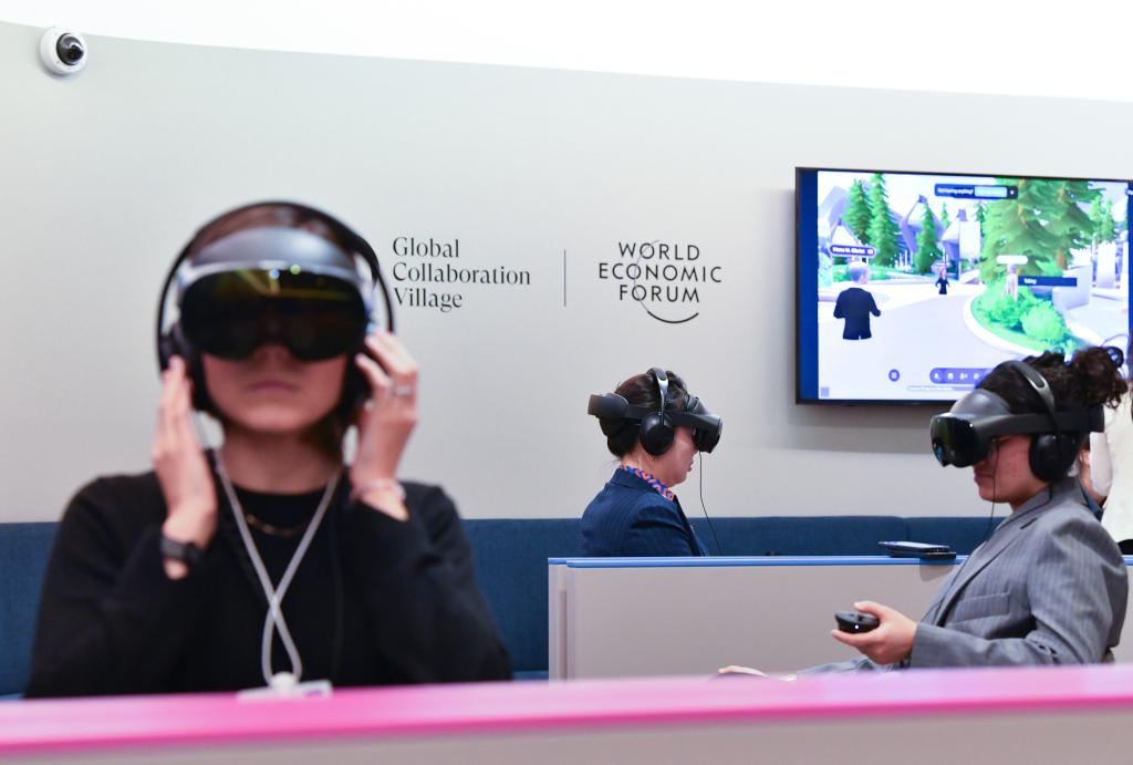 1月23日,在瑞士達沃斯,與(yu) 會(hui) 者借助VR設備沉浸式參加世界經濟論壇2025年年會(hui) 。新華社記者連漪攝