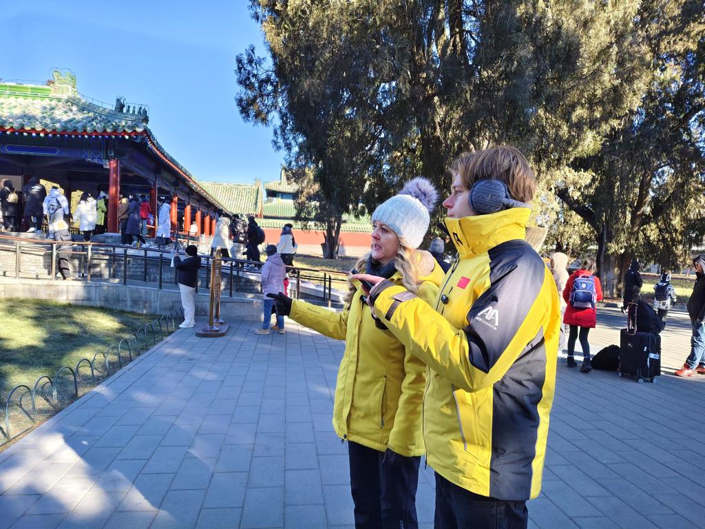 祈年殿、皇穹宇、圜丘……路過一個(ge) 個(ge) 景點,記者為(wei) 他們(men) 介紹起建築背後的曆史和“天人合一”理念,母子二人聽得津津有味。當天北京戶外溫度低至零下8攝氏度,手凍得生疼,但絲(si) 毫未影響埃米爾和媽媽拍照記錄的熱情。
