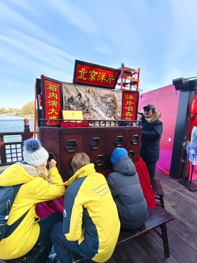 烏(wu) 爾麗(li) 克與(yu) 埃米爾在什刹海看北京洋片表演。新華社記者於(yu) 佳欣 攝