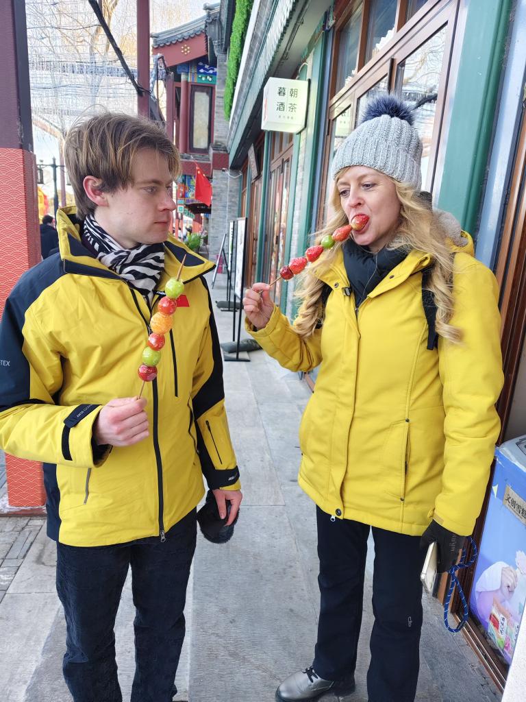烏(wu) 爾麗(li) 克與(yu) 埃米爾在什刹海吃糖葫蘆。新華社記者於(yu) 佳欣 攝