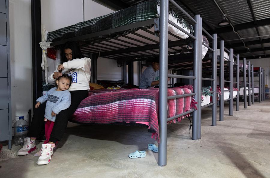 2025年2月2日,在墨西哥奇瓦瓦州華雷斯城的一處移民收容所,一位母親(qin) 為(wei) 女兒(er) 梳頭。新華社記者李夢馨攝