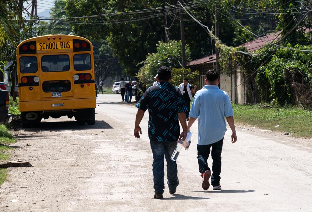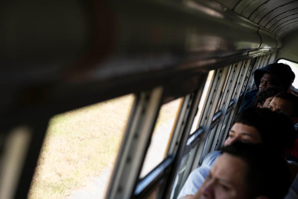 2月14日,在洪都拉斯西北部城市聖佩德羅蘇拉,返鄉(xiang) 移民乘坐返鄉(xiang) 移民援助中心的巴士前往車站。新華社發(戴維 攝)