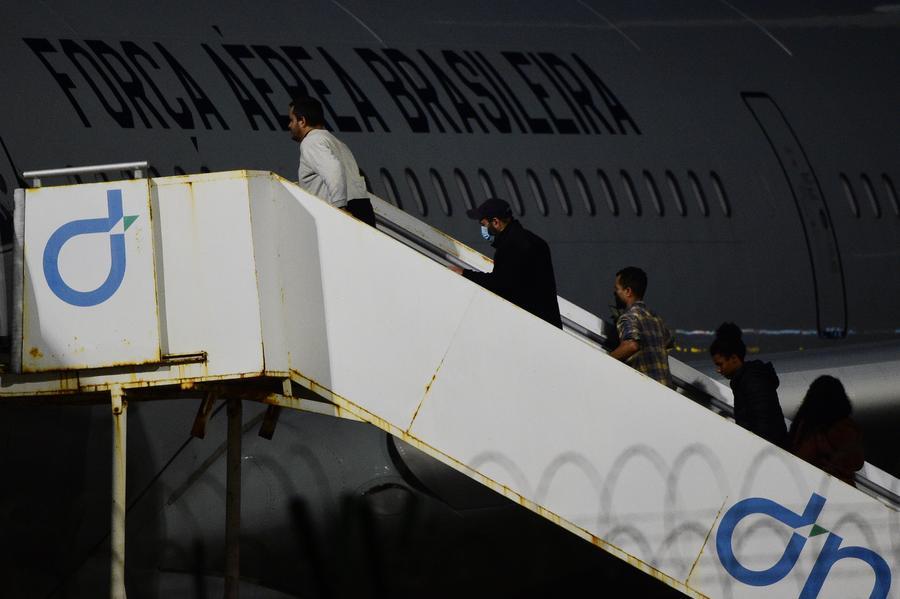 2025年2月7日,在巴西東(dong) 北部塞阿拉州福塔萊薩市,被美國驅逐出境的第二批巴西非法移民登上一架巴西空軍(jun) 飛機。新華社發 盧西奧·塔沃拉 攝