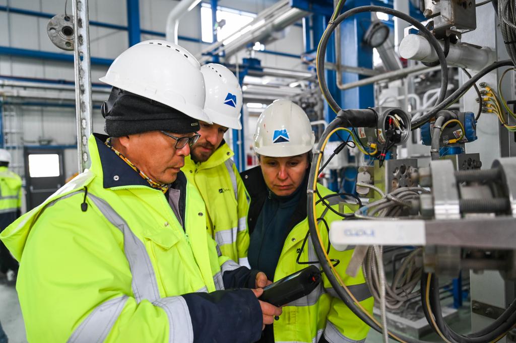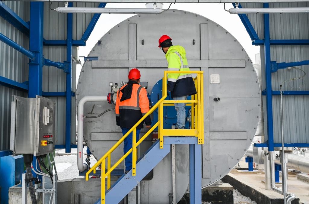 2月12日,中土兩(liang) 國工程師在土耳其阿克薩拉伊省的圖茲(zi) 湖地下天然氣儲(chu) 庫擴建項目地麵場站查看設備。新華社記者劉磊攝