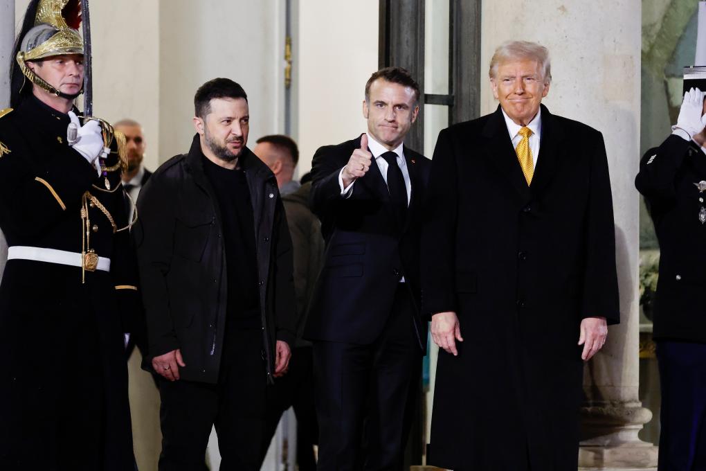 2024年12月7日,法國總統馬克龍(左三)與(yu) 美國當選總統特朗普(右)和烏(wu) 克蘭(lan) 總統澤連斯基(左二)會(hui) 晤後走出愛麗(li) 舍宮。新華社發(亨利·施瓦茨攝)