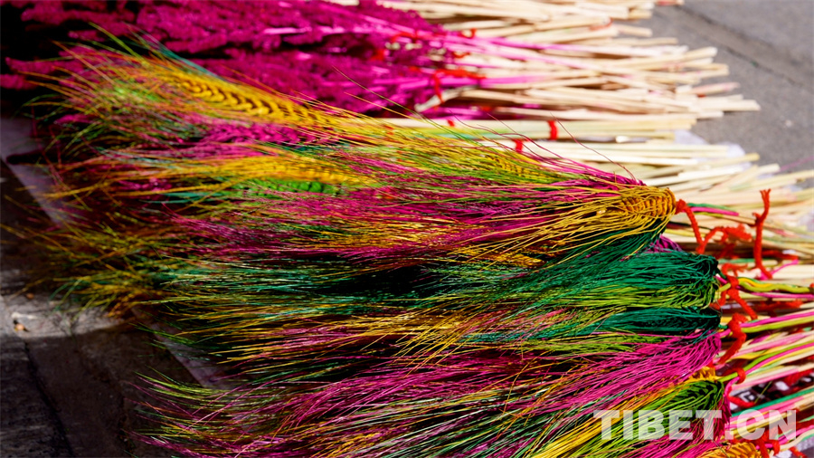 在藏曆新年年貨物品中,提及酥油花就不得不提它的“搭檔”“羅薩梅朵”,正是因為(wei) 它們(men) 的裝點讓藏曆新年中本身就已很精致的“切瑪盒”更加亮眼。“羅薩梅朵”被稱為(wei) “冬季裏最美麗(li) 的花”,是經過染色的麥穗和青稞穗製作成的“花卉”。在藏曆新年或節日之時,人們(men) 將其插在盛滿糌粑和青稞的“切瑪盒”上,寓意新的一年美滿、豐(feng) 收。