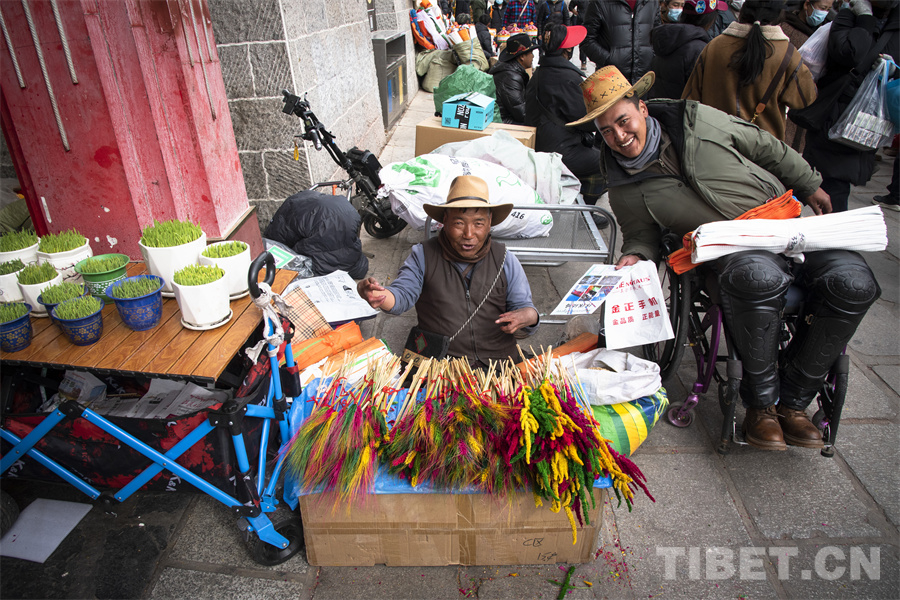 普瓊,來自日喀則市江孜縣,在八廓商城南門前經營著自己的“羅薩梅朵”小攤。初見普瓊,我們(men) 被他衝(chong) 著鏡頭的燦爛笑容所吸引。細細觀察,普瓊坐在地上的身高卻比別人矮了一大截。“我們(men) 從(cong) 拉薩堆龍德慶的批發市場上買(mai) 來這批‘羅薩梅朵’在此銷售,就希望能夠在年前的這段時間多賺些小錢補貼家用,所有人都想在新年之時過個(ge) 充裕的‘好年’,不是嗎?”普瓊因一次意外高位截癱,失去雙腿的他並沒有消沉。他選擇積極麵對生活,用自己的雙手和命運抗爭(zheng) ,用堅強和勤勞讓自己和全家過上更好的生活。與(yu) 普瓊不幸的經曆相比,我們(men) 每個(ge) 人過的每個(ge) 年何嚐不都是一個(ge) 個(ge) “好年”呢?普瓊對生活的那種熱愛,對明天會(hui) 更好的堅定,何嚐不是我們(men) 對每一個(ge) “好年”所孜孜追求的呢?