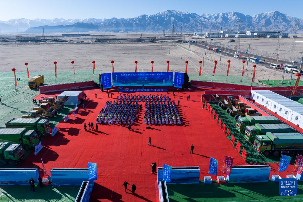 這是2月26日拍攝的柴達木格爾木東(dong) 沙漠基地電源項目開工活動現場(無人機照片)。新華社記者 陳傑 攝