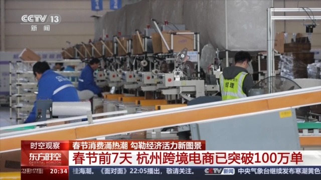 春節期間,在杭州跨境電商綜試區,一排排貨架上整齊碼放著來自世界各地的“特產(chan) ”,工作人員正在分揀、打包,一派繁忙景象。