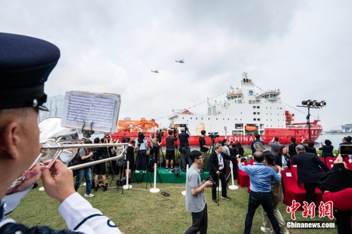 這次,香港更是以“海陸空”上陣歡迎“雪龍2”號到訪香港。在“雪龍2”號不遠處,兩(liang) 艘拖船和一艘消防船在碼頭附近對射水柱,形成水拱門。香港飛行服務隊的直升機飛過維多利亞(ya) 港上空示意致敬,香港警察銀樂(le) 隊在現場奏樂(le) ,九龍巴士車隊貼上歡迎“雪龍2”號標誌,還有舞獅隊歡迎“雪龍2”號來到香港。