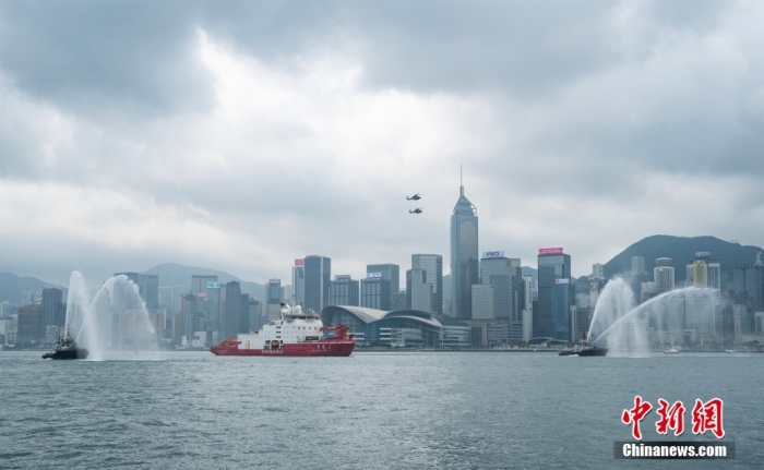 4月8日上午,中國首艘自主建造的極地科學考察破冰船“雪龍2”號抵達香港。圖為(wei) “雪龍2”號通過維多利亞(ya) 港時收到海事傳(chuan) 統噴水歡迎。中新社記者 侯宇 攝