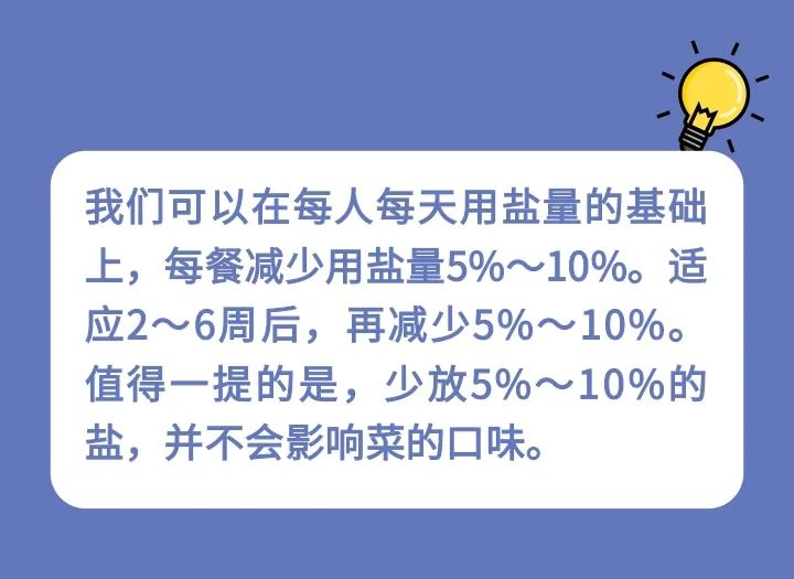 我們(men) 可以根據人數來確定一天吃鹽的最大量。比如,今天家裏有3個(ge) 人吃飯,那麽(me) 吃鹽的最大量就是15克。1勺鹽是2克,所以一天當中吃的鹽不能超過8勺。計算好之後,就可以把定量好的鹽事先舀出來,放在一個(ge) 固定的容器中。到烹飪時,從(cong) 這個(ge) 容器中取用鹽。時間久了,大家對鹽的量就能做到心中有數,某一天即便不用限鹽勺,也可以做到鹽不過量。