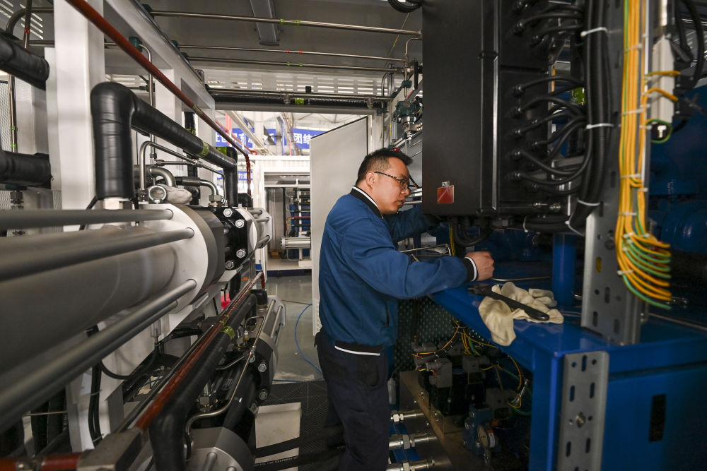 在位於(yu) 山西省長治市高新技術產(chan) 業(ye) 開發區科技工業(ye) 園的一家公司內(nei) ,工作人員在調試氫能設備(4月2日攝)。新華社記者 楊晨光 攝