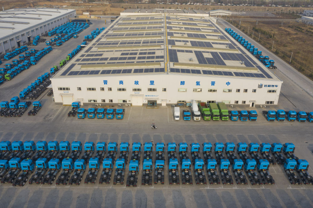 這是在位於(yu) 山西省晉中市榆次區的山西新能源汽車工業(ye) 有限公司(吉利晉中基地)拍攝的甲醇重卡(4月1日攝,無人機照片)。新華社記者 楊晨光 攝