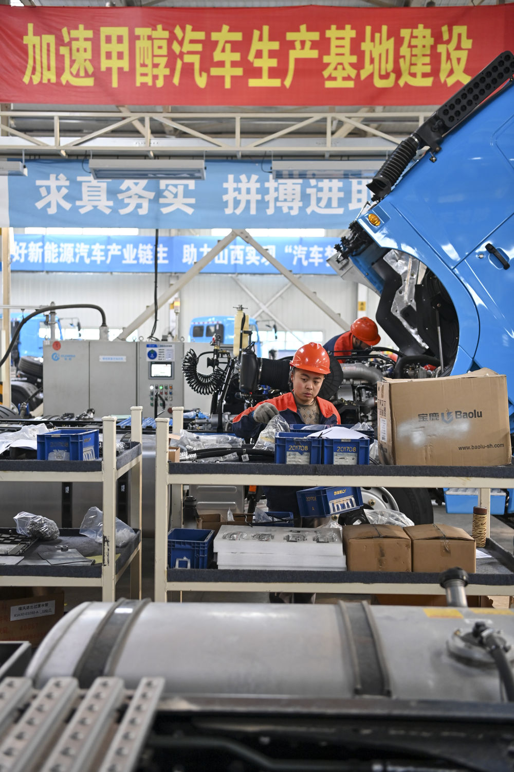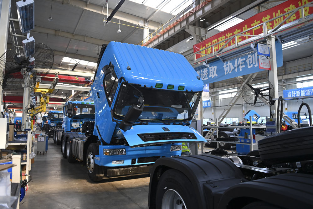 工作人員在位於(yu) 山西省晉中市榆次區的山西新能源汽車工業(ye) 有限公司(吉利晉中基地)生產(chan) 甲醇重卡(4月1日攝)。新華社記者 楊晨光 攝
