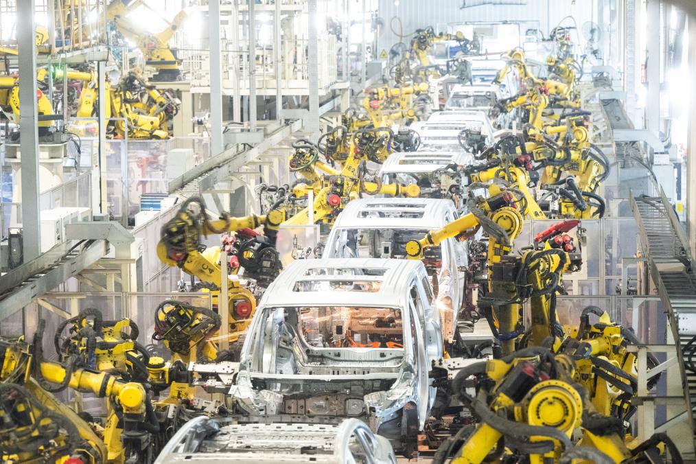 4月1日,在位於(yu) 湖北武漢市經開區的嵐圖汽車電動化焊裝車間,機器人在流水線上作業(ye) 。新華社記者 肖藝九 攝