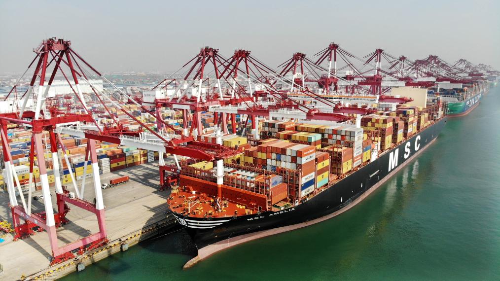 3月13日,貨輪在山東(dong) 港口青島港裝卸集裝箱(無人機照片)。新華社記者 李紫恒 攝