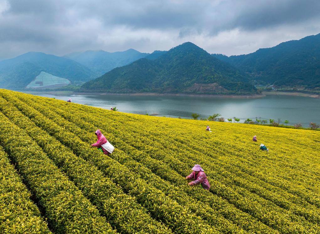 4月7日,茶農(nong) 在浙江省寧波市鄞州區橫溪茶園采茶(無人機照片)。新華社發(胡學軍(jun) 攝)