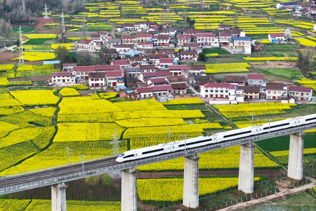3月20日,西成高鐵線上的列車駛過陝西漢中市南鄭區陽春鎮(無人機照片)。新華社記者 邵瑞 攝