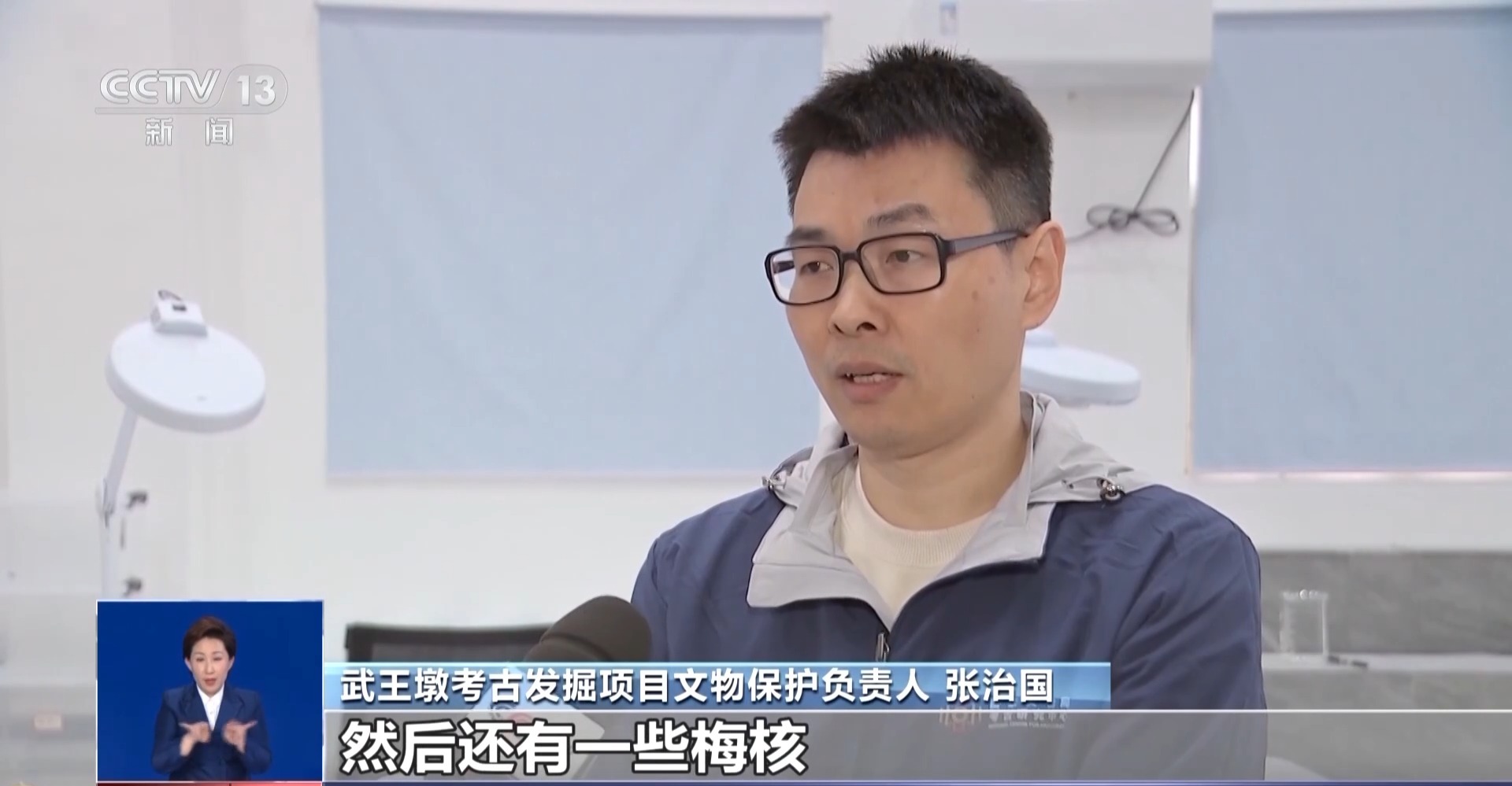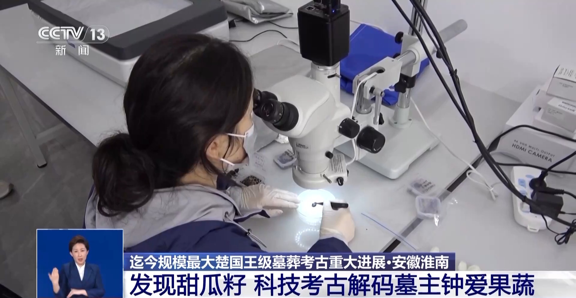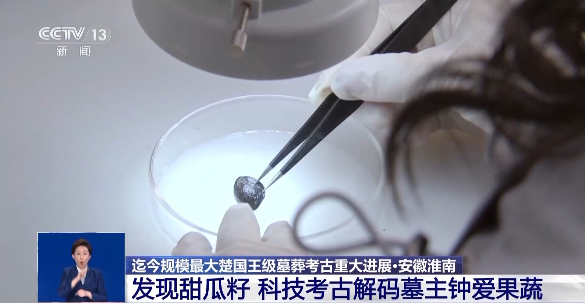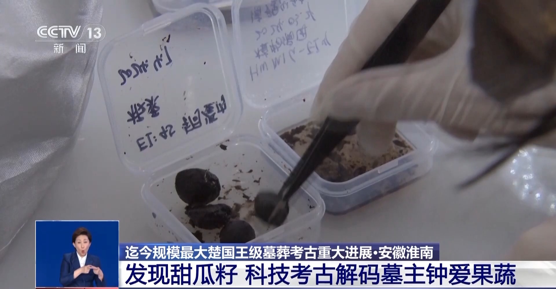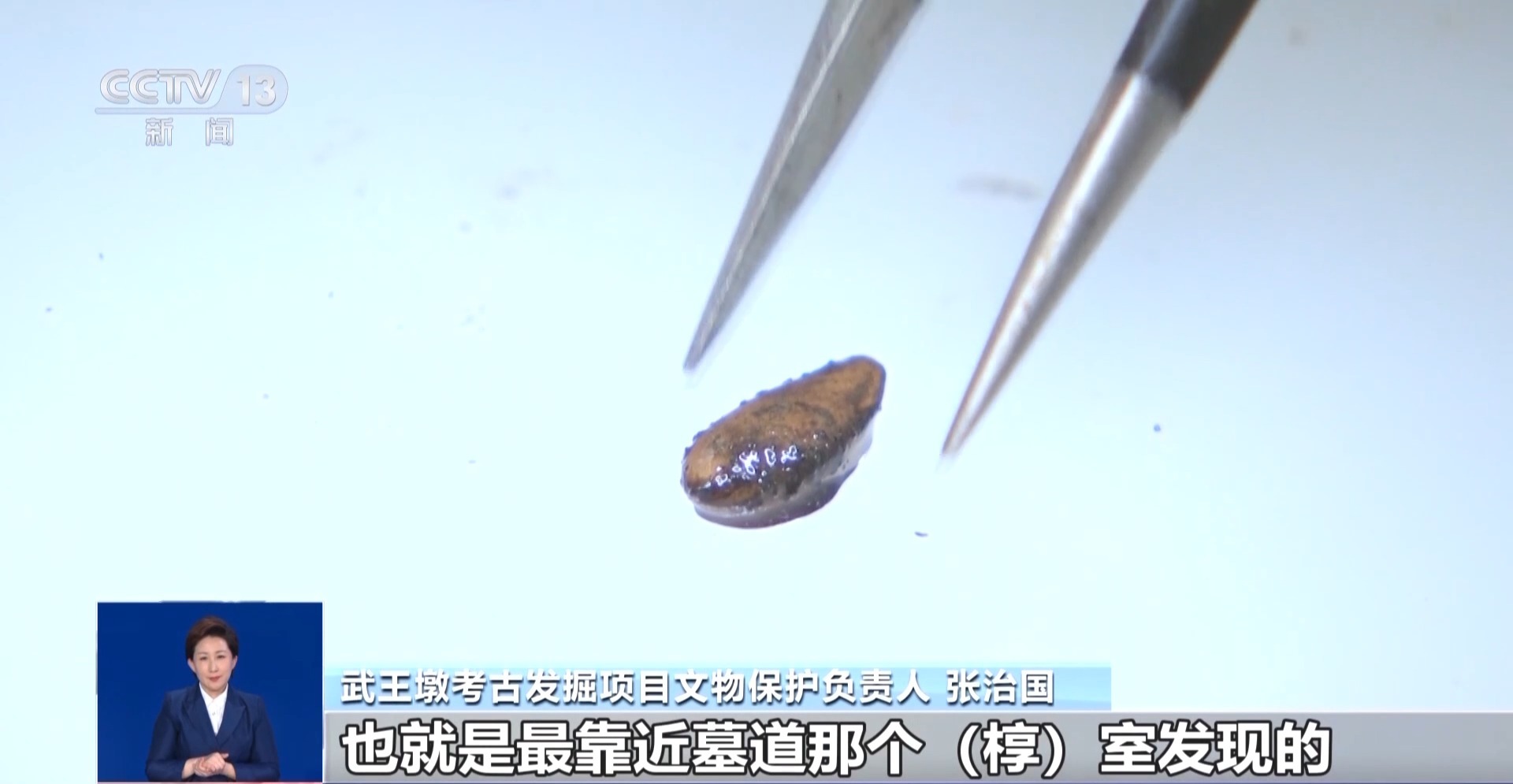 武王墩考古發掘項目文物保護負責人 張治國:發現大部分的這個(ge) 裏麵都是一些樹葉,然後還有果核,可能還有一些草編的痕跡,目前初步鑒定出來的有甜瓜籽,然後還有一些梅核。