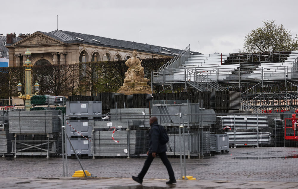 4月2日,行人經過法國巴黎協和廣場的奧運比賽場地和看台建設工地。新華社記者 高靜 攝