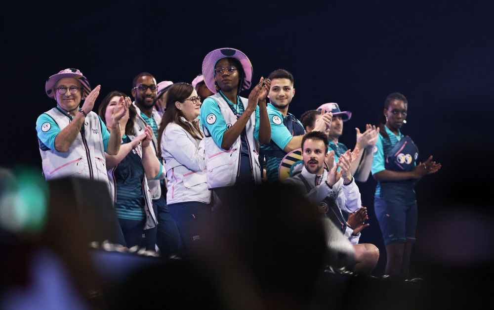 3月23日,模特在巴黎奧運會(hui) 誌願者大會(hui) 上展示誌願者製服。新華社記者 高靜 攝