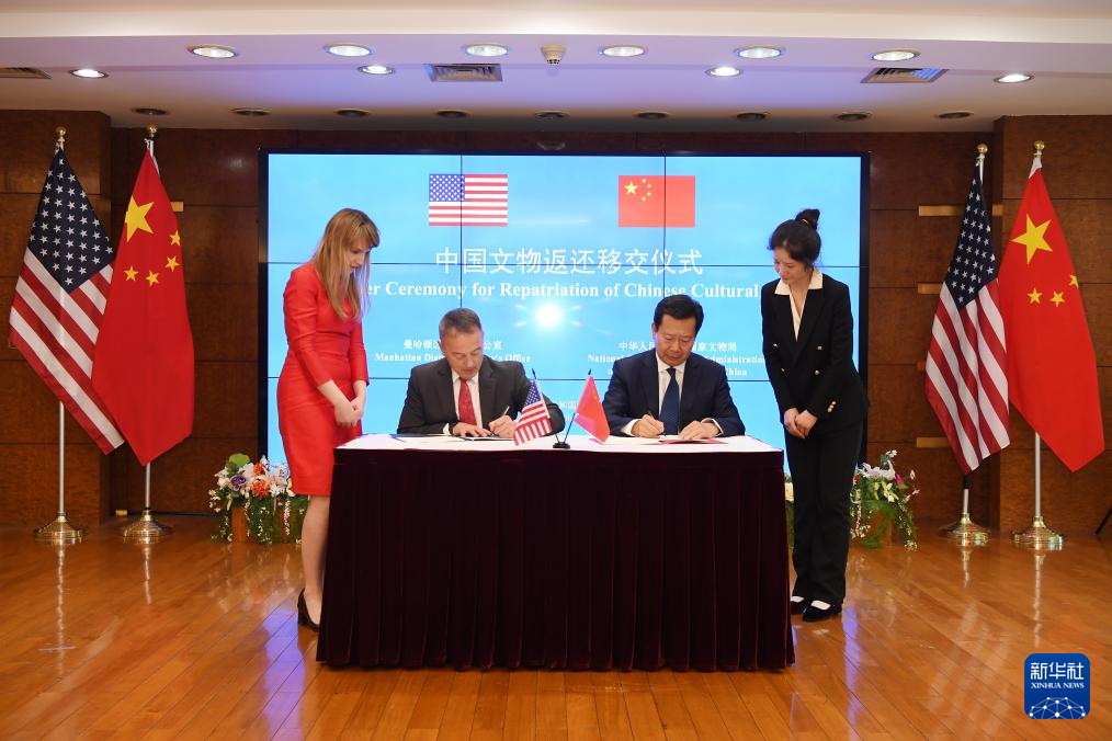 4月17日,在美國紐約中國駐紐約總領館,中美雙方代表出席中國流失文物藝術品返還移交儀(yi) 式。新華社記者 李睿 攝