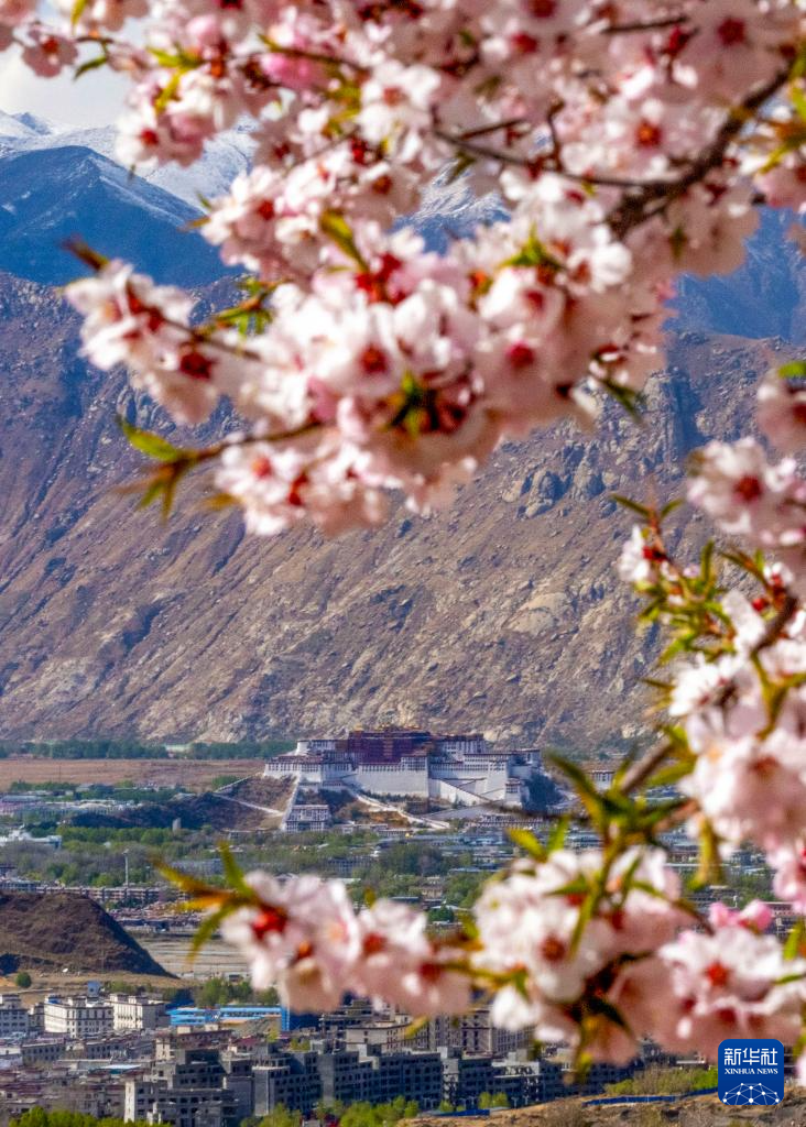 桃花映襯著布達拉宮(4月17日攝)。新華社記者 薑帆 攝