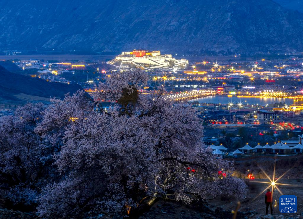 夜色中桃花映襯著布達拉宮(4月16日攝)。新華社記者 薑帆 攝