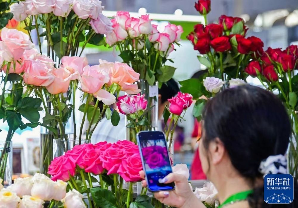 觀眾(zhong) 在國貨特色潮品展區雲(yun) 南展台拍照,雲(yun) 南展台為(wei) 本屆消博會(hui) 準備了8000餘(yu) 支、20多個(ge) 品種的雲(yun) 南本土鮮切玫瑰。新華社記者王楚天 攝