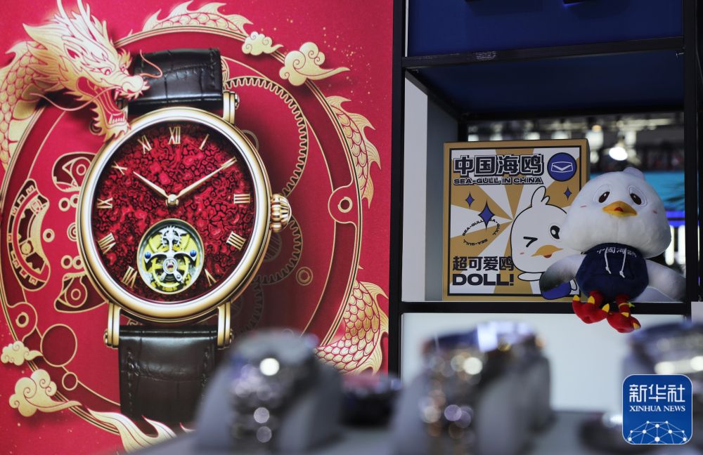 圖為(wei) 天津館海鷗國潮風格手表展櫃。本屆消博會(hui) 上,“老字號”帶來的國潮新品不僅(jin) 有著海派文化和傳(chuan) 統文化元素,還與(yu) 獨具匠心的年輕創意相融合。