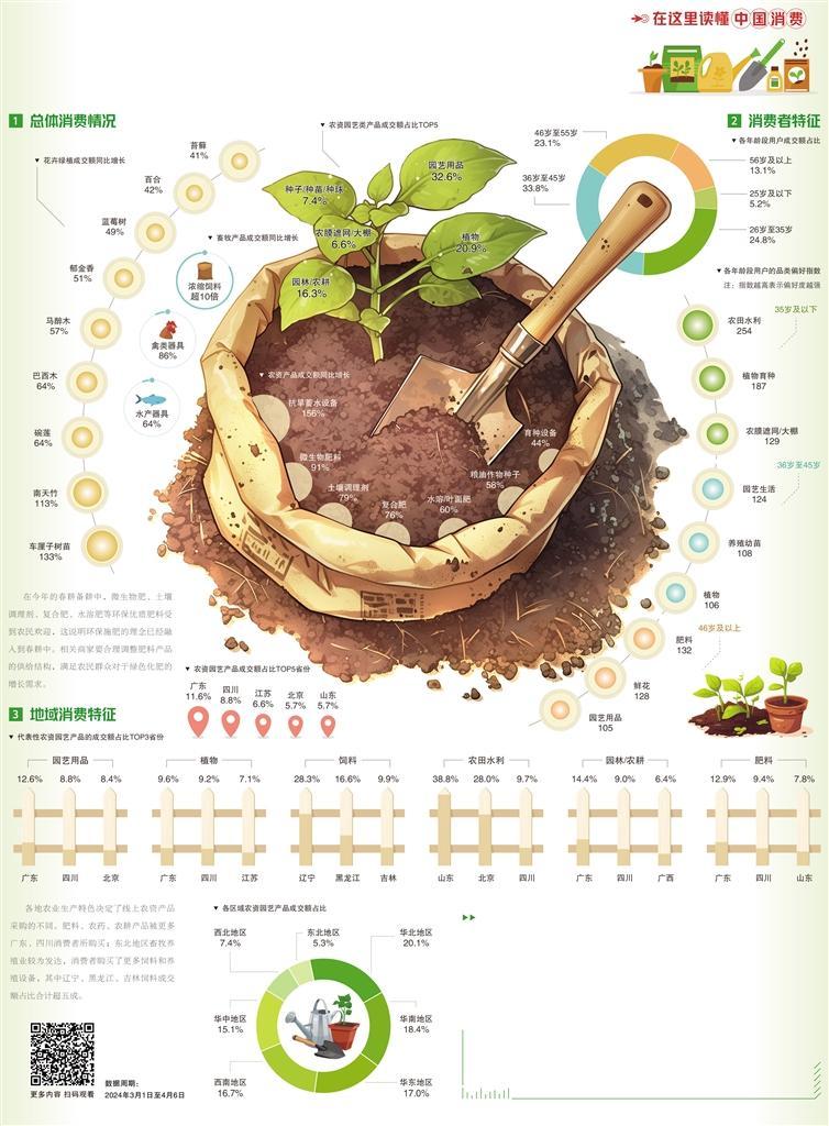 此外,畜牧業(ye) 生產(chan) 、城市花草種植需求也成為(wei) 春耕消費的新亮點。鄉(xiang) 村養(yang) 殖戶抓住春季時節推進畜禽填槽補欄,濃縮飼料、禽類器具、水產(chan) 器具成為(wei) 受歡迎的產(chan) 品,其中濃縮飼料的成交額同比增長超10倍。城市居民購買(mai) 了更多的花卉綠植,為(wei) 自家陽台、花園、辦公室增添濃濃春意,車厘子樹苗、南天竹、巴西木、鬱金香是最受青睞的品類。