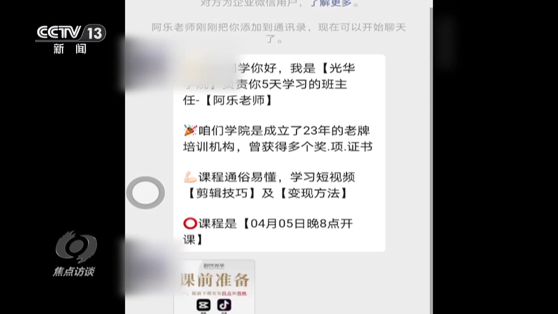 黃先生的遭遇並不是個(ge) 案。記者瀏覽多個(ge) 網絡平台,發現類似的廣告比比皆是,五花八門,0元學配音、0元學書(shu) 法、0元學易經……記者隨機點開了一家賬號主體(ti) 為(wei) 北京時代光華科技有限公司的0元5天剪輯直播課,添加所謂的老師微信之後就被拉進了一個(ge) 微信群,4月5日晚上8點,課程開始了。