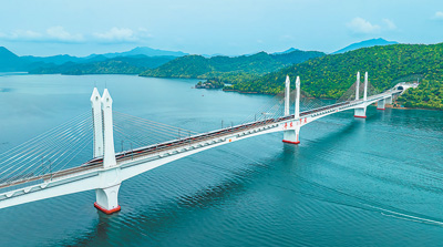 圖為(wei) 4月26日,複興(xing) 號智能動車組列車駛過池黃高鐵太平湖特大橋。王 磊攝(人民視覺)