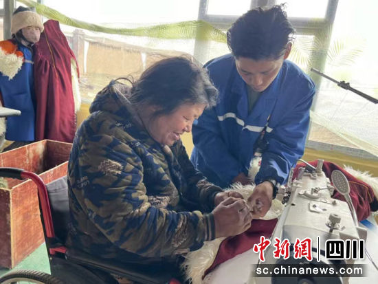 紮西奪爾登幫助殘疾員工裁剪。阿壩州文明辦供圖
