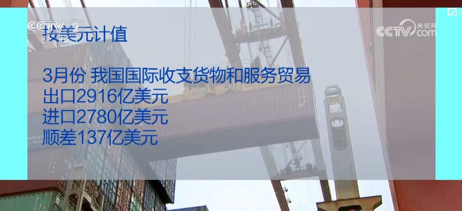 國家外匯管理局發布數據,3月份,我國國際收支貨物和服務貿易進出口規模為(wei) 40430億(yi) 元,同比增長3%。其中,貨物貿易出口18556億(yi) 元、進口16053億(yi) 元;服務貿易出口2144億(yi) 元、進口3677億(yi) 元。按美元計值,3月份,我國國際收支貨物和服務貿易出口2916億(yi) 美元、進口2780億(yi) 美元、順差137億(yi) 美元。