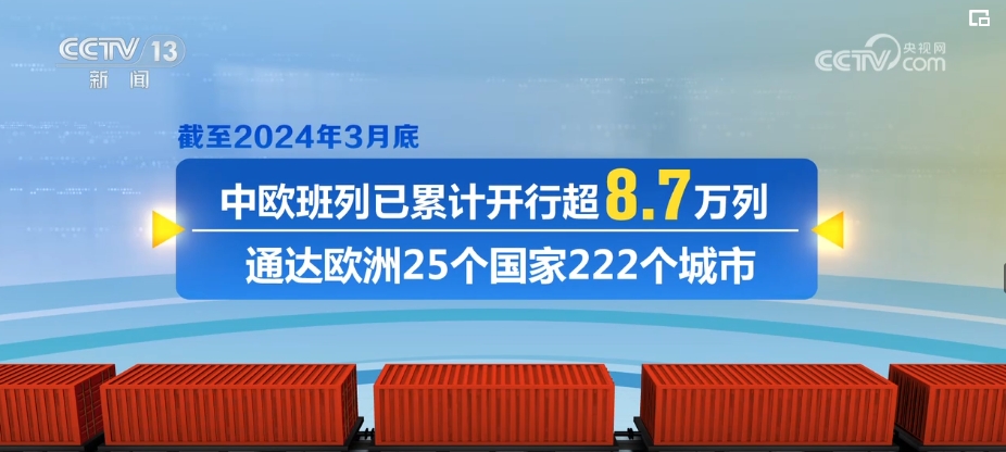 2024年一季度,中歐班列累計開行4541列、發送貨物49.3萬(wan) 標箱,同比分別增長9%、10%。截至2024年3月底,中歐班列已累計開行超8.7萬(wan) 列,通達歐洲25個(ge) 國家222個(ge) 城市。
