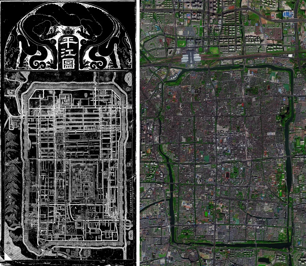 拚版照片:左圖為(wei) 宋代碑刻《平江圖》(資料照片);右圖為(wei) 2023年3月拍攝的蘇州古城的衛星圖像。新華社發