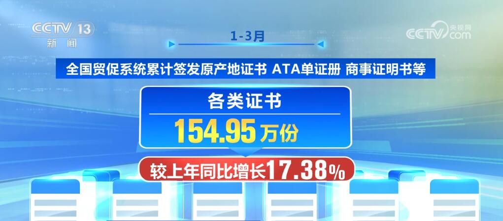 1—3月,全國貿促係統累計簽發原產(chan) 地證書(shu) 、ATA單證冊(ce) 、商事證明書(shu) 等各類證書(shu) 154.95萬(wan) 份,較上年同比增長17.38%。其中,全國貿促係統非優(you) 惠原產(chan) 地證書(shu) 簽證金額共計849.31億(yi) 美元,同比增長2.47%;全國貿促係統優(you) 惠原產(chan) 地證書(shu) 簽證金額共計161.21億(yi) 美元,同比增長4.73%。