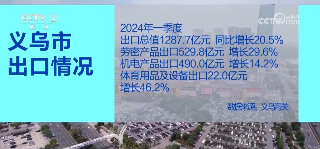數據顯示,2024年一季度,義(yi) 烏(wu) 市出口總值達1287.7億(yi) 元,同比增長20.5%。其中,勞密產(chan) 品出口529.8億(yi) 元,增長29.6%;機電產(chan) 品出口490.0億(yi) 元,增長14.2%;而體(ti) 育用品及設備出口達到22.0億(yi) 元,增長46.2%。業(ye) 內(nei) 人士表示,巴黎奧運會(hui) 即將召開,以及外商聖誕采購季開始,歐美市場補庫存需求增加,使得相關(guan) 產(chan) 品出口占比顯著提升。