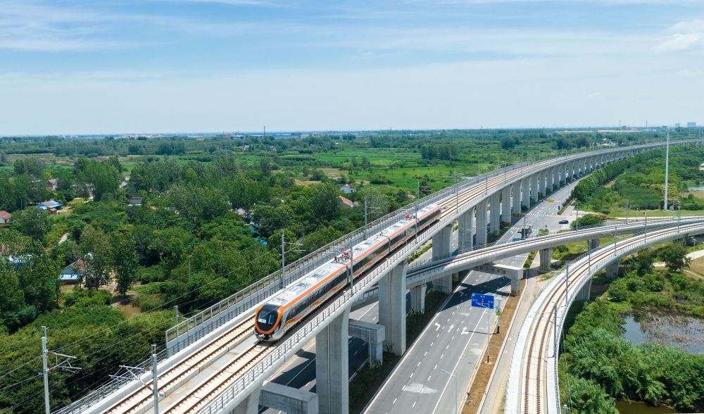 這是在滁州市拍攝的滁寧城際鐵路列車(2023年6月28日攝,無人機照片)。新華社記者 劉軍(jun) 喜 攝